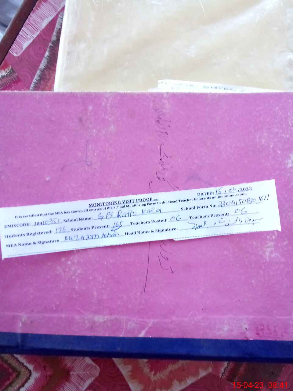 | Certified that this School was Inspected by the Undersigned MEA/DMO Today and the Information Stated Above is as Per Record. | |||||