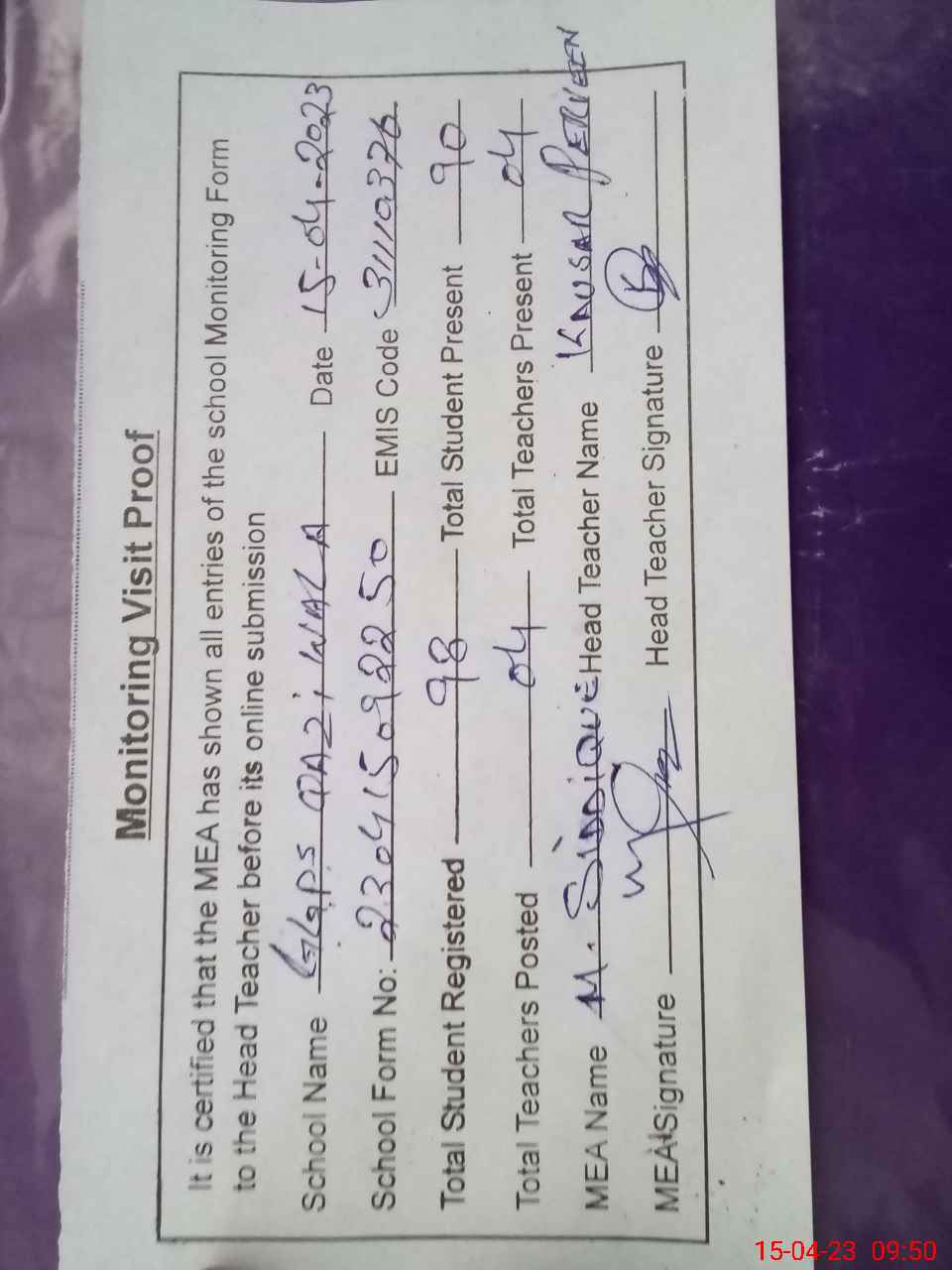 | Attendance Register | Head Teacher | MEA with School | Visit Proof |