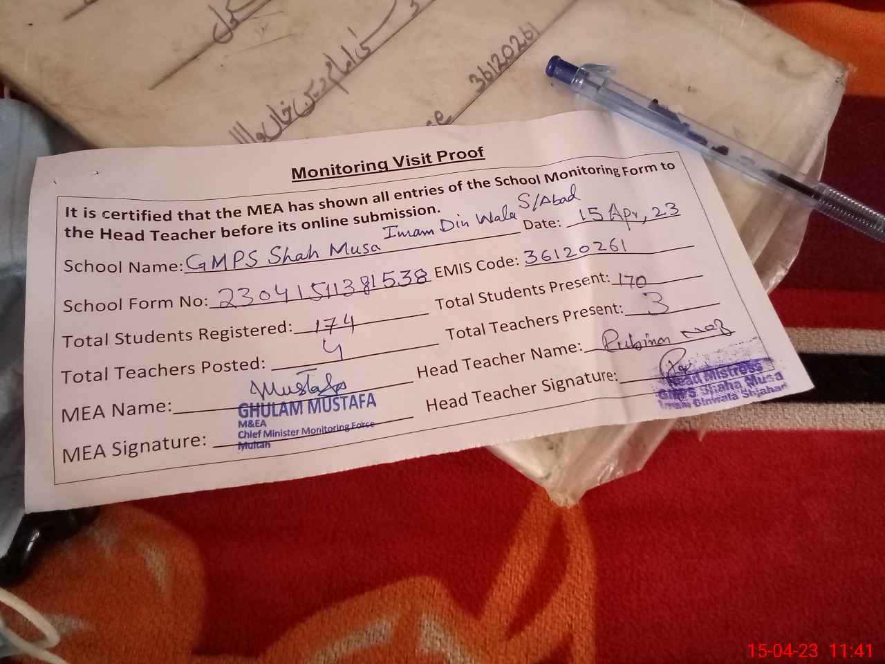 | Attendance Register | Head Teacher | MEA with School | Visit Proof |