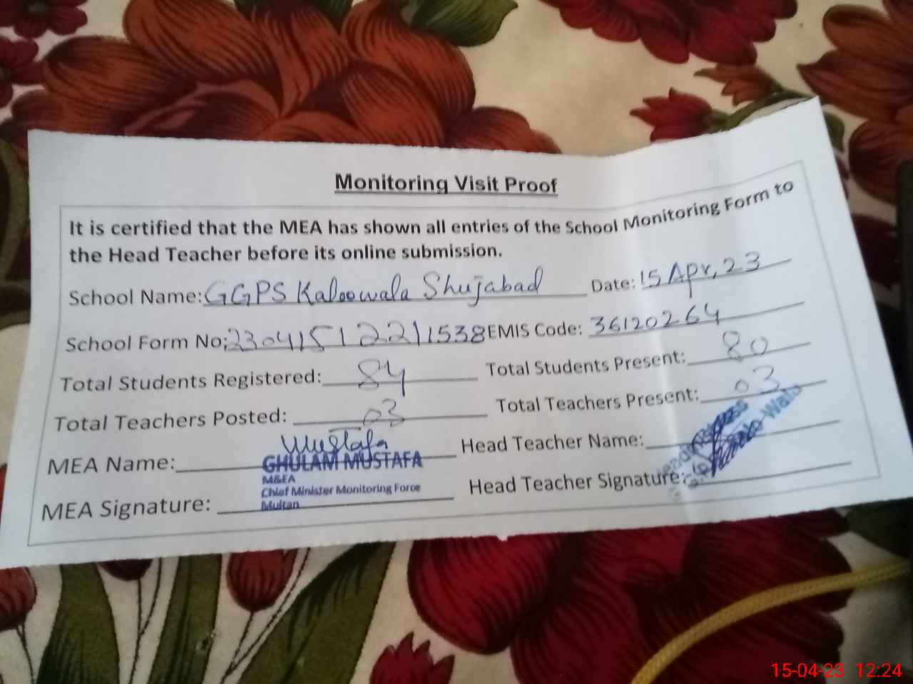 | EMIS Code: 36120264 | Name of School: GGPS KALOO WALA SHUJABAD | |||