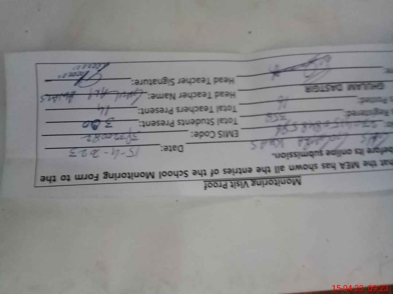 | Attendance Register | Head Teacher | MEA with School | Visit Proof |