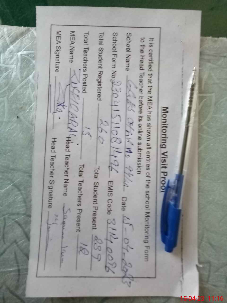 | Attendance Register | Head Teacher | MEA with School | Visit Proof |