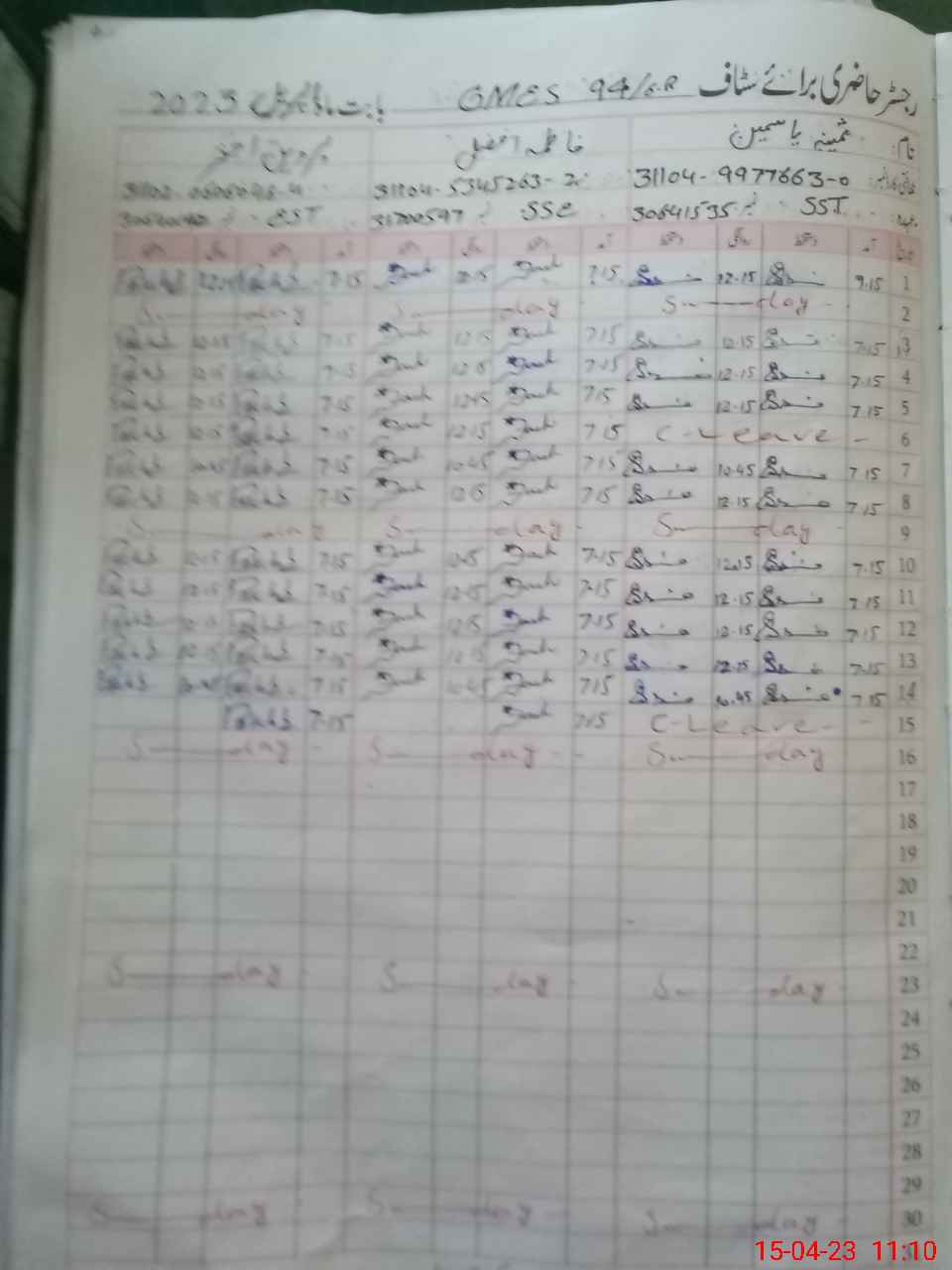 | CNIC | Full Name | Designation | R/C | Absence During Last Calender Month |