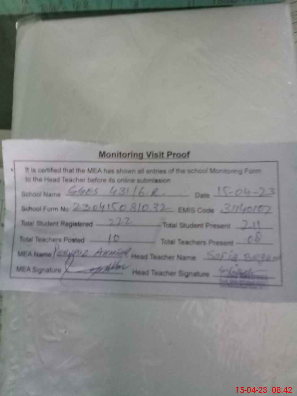 | Attendance Register | Head Teacher | MEA with School | Visit Proof |
