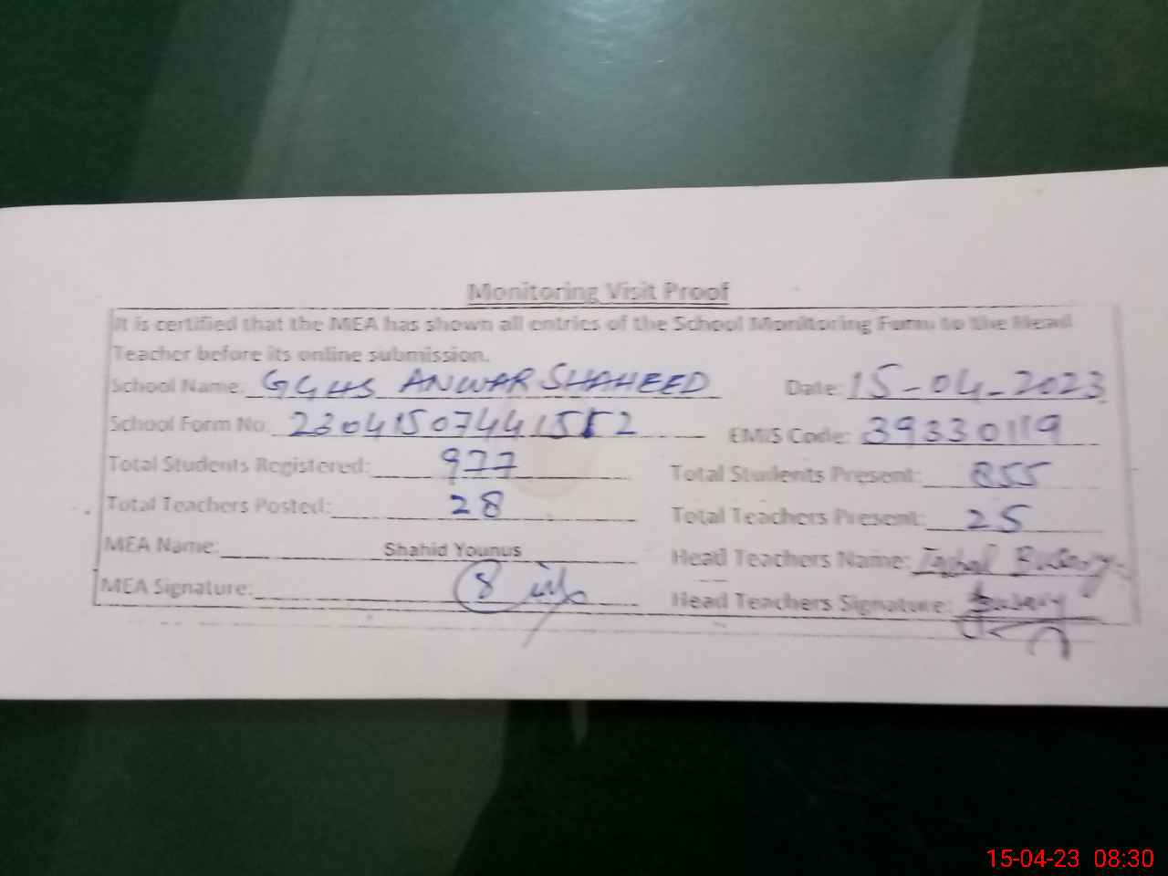 | Attendance Register | Head Teacher | MEA with School | Visit Proof |