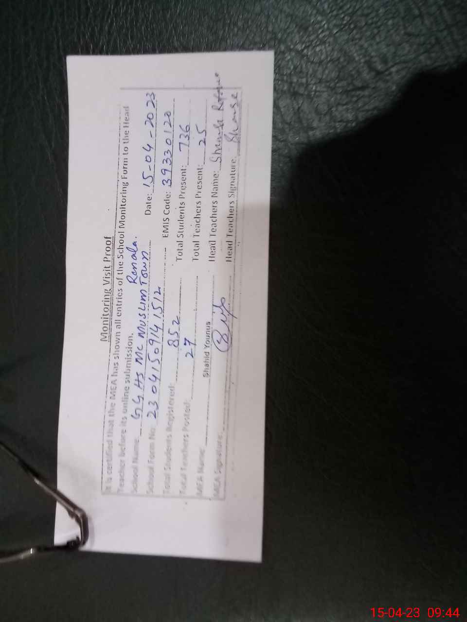 | Attendance Register | Head Teacher | MEA with School | Visit Proof |