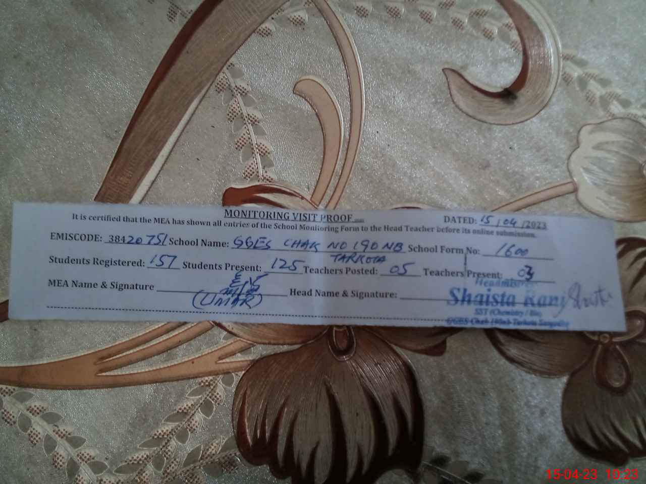 | Attendance Register | Head Teacher | MEA with School | Visit Proof |