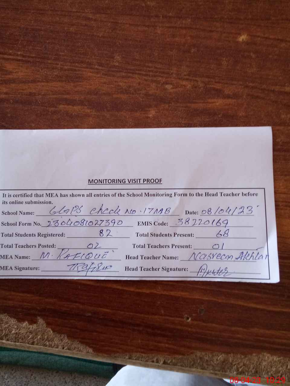| EMIS Code: 38220169 | Name of School: GGPS CHAK NO 17 MB | |||
