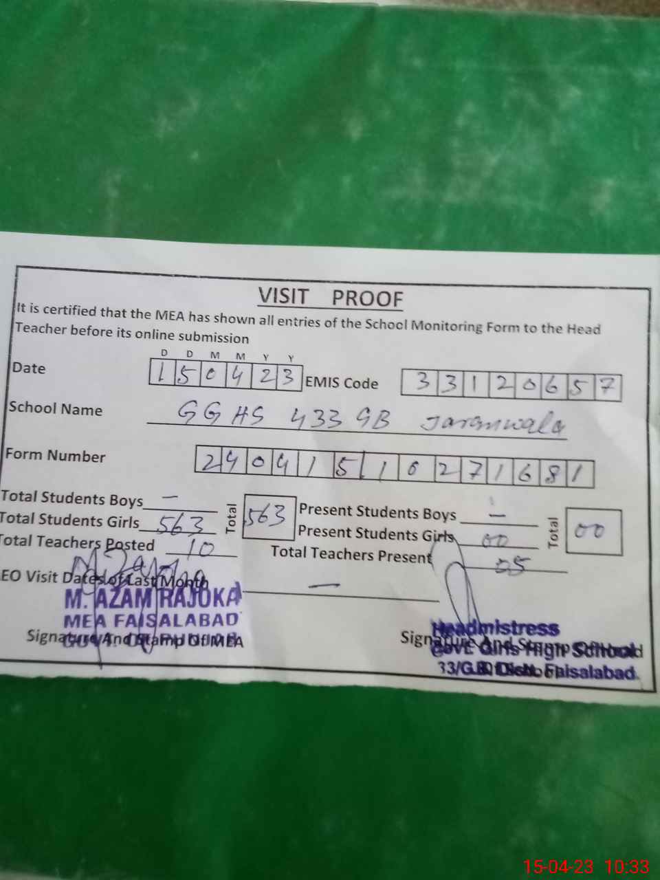 | EMIS Code: 33120657 | Name of School: GGHS CHAK 433 GB JHOKE DITTA | |||