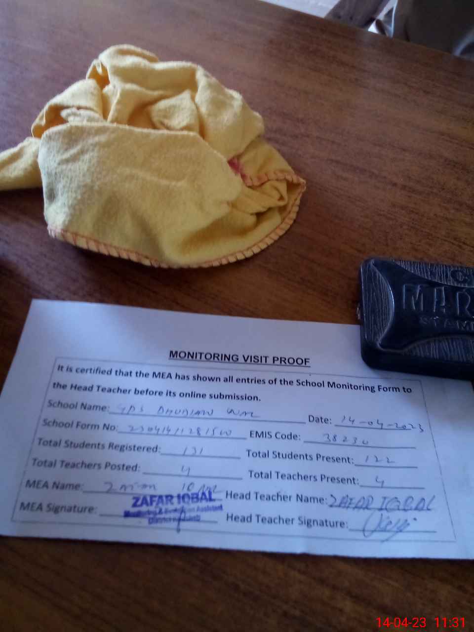 | Attendance Register | Head Teacher | MEA with School | Visit Proof |
