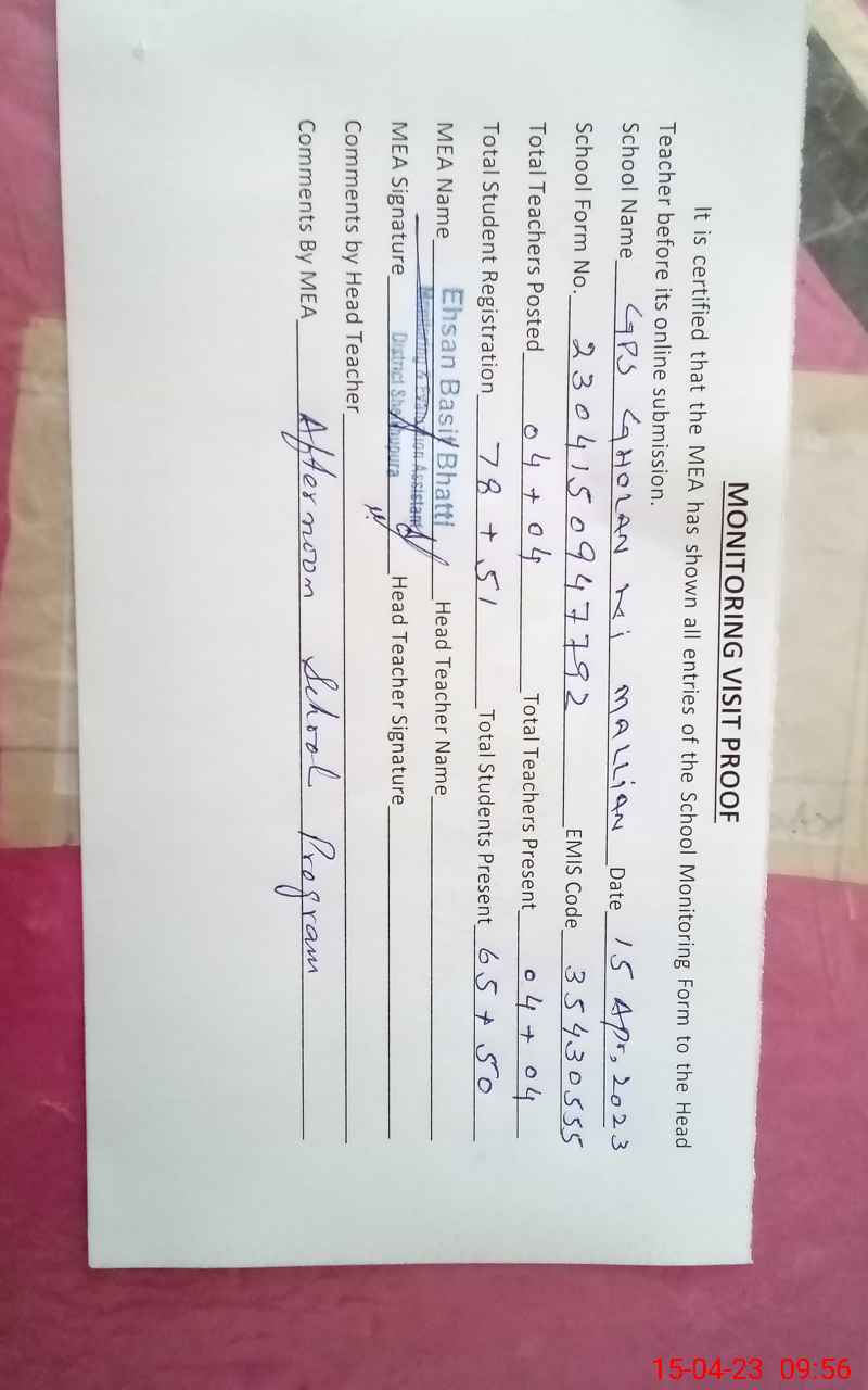 | EMIS Code: 35430555 | Name of School: GPS GHOLAN KE MALIAN | |||