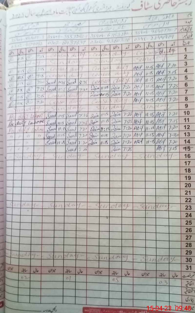 | CNIC | Full Name | Designation | R/C | Absence During Last Calender Month |