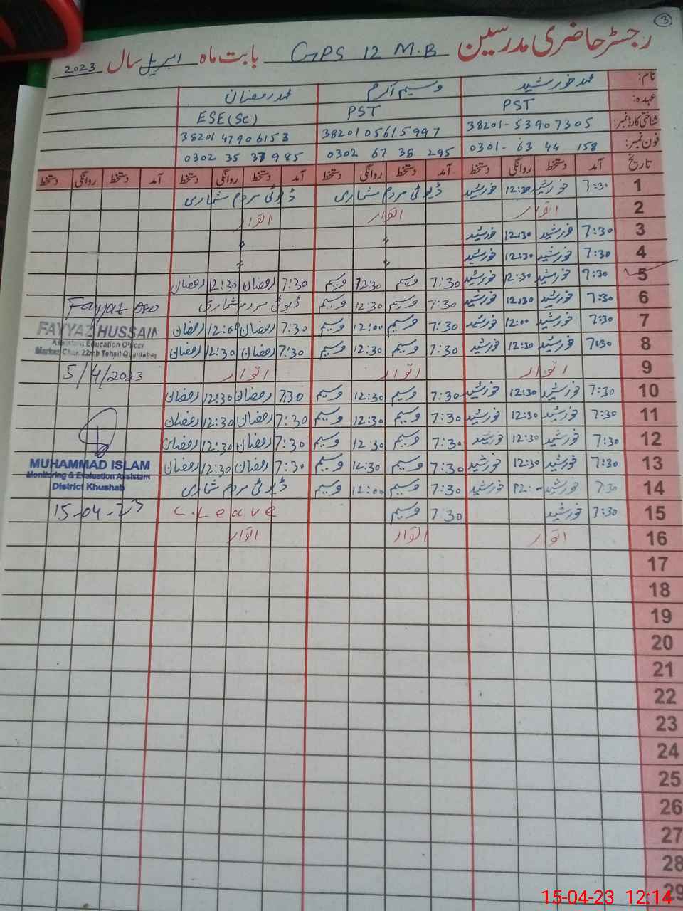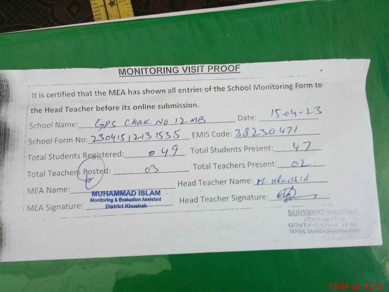 | EMIS Code: 38230471 | Name of School: GPS CHAK NO. 12 MB | |||