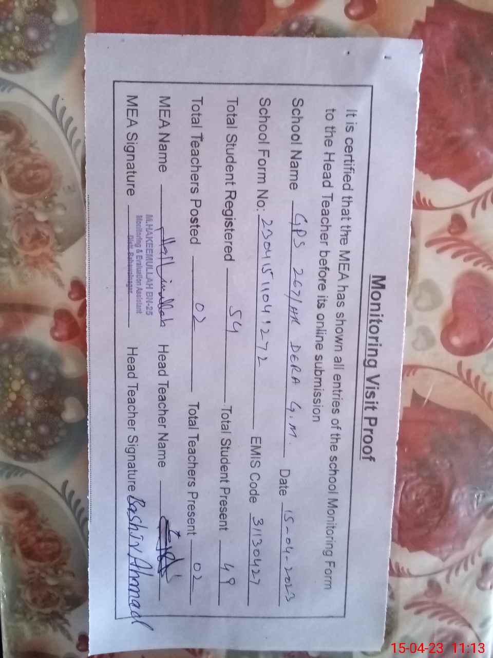 | Attendance Register | Head Teacher | MEA with School | Visit Proof |