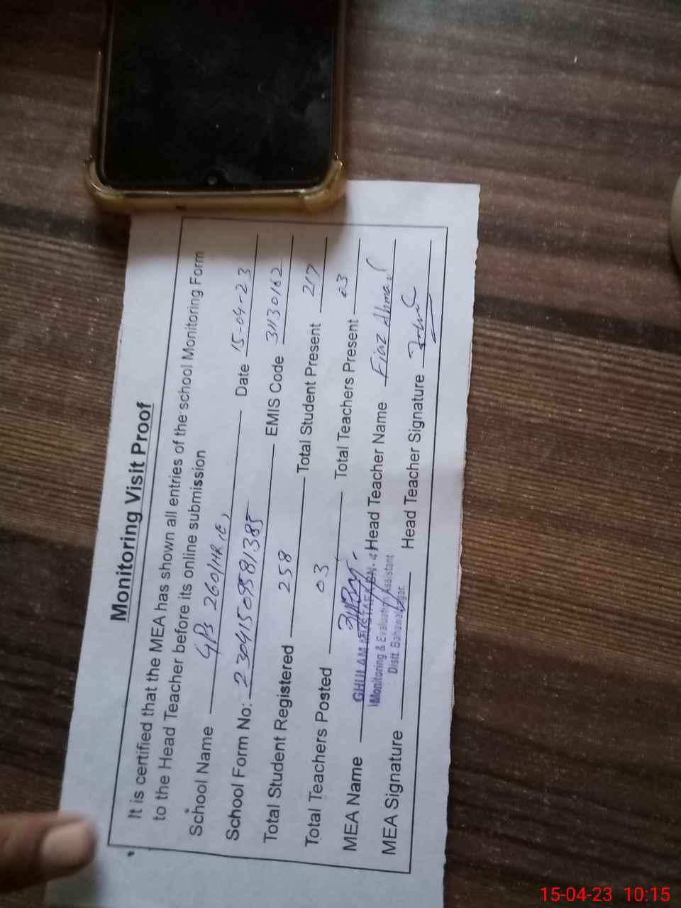 | Attendance Register | Head Teacher | MEA with School | Visit Proof |