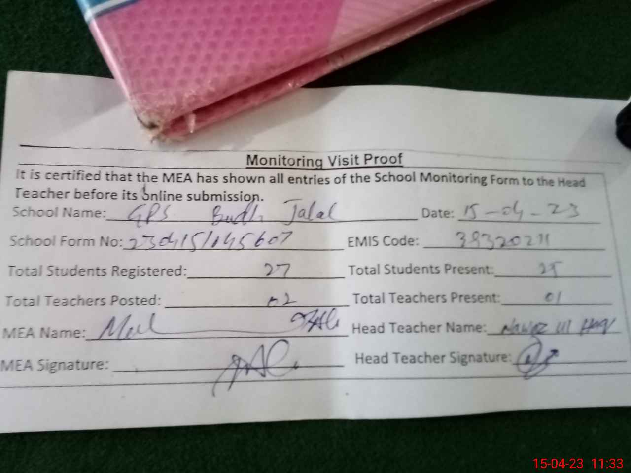 | EMIS Code: 39320211 | Name of School: GPS BUDDH JALAL | |||