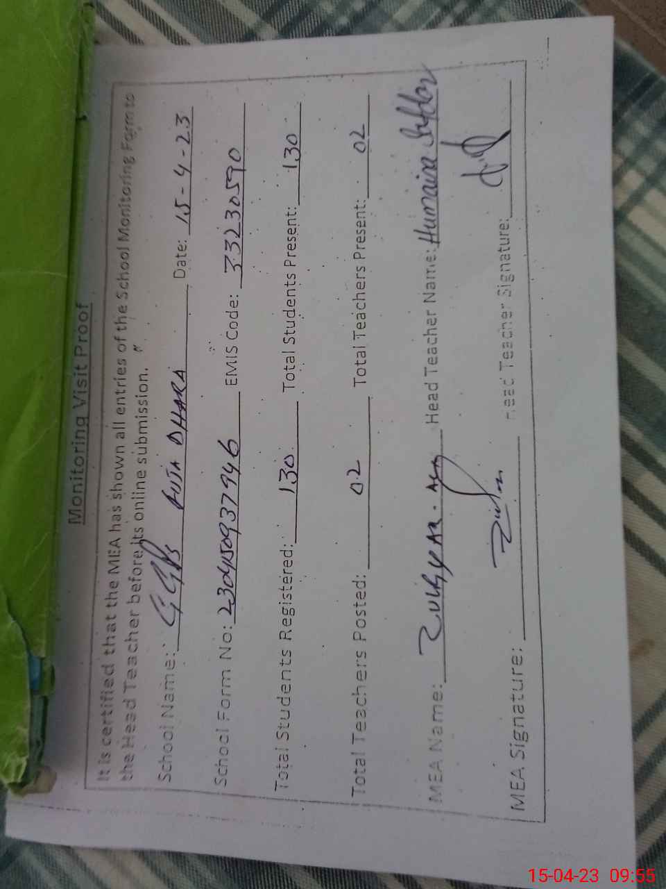 | Attendance Register | Head Teacher | MEA with School | Visit Proof |