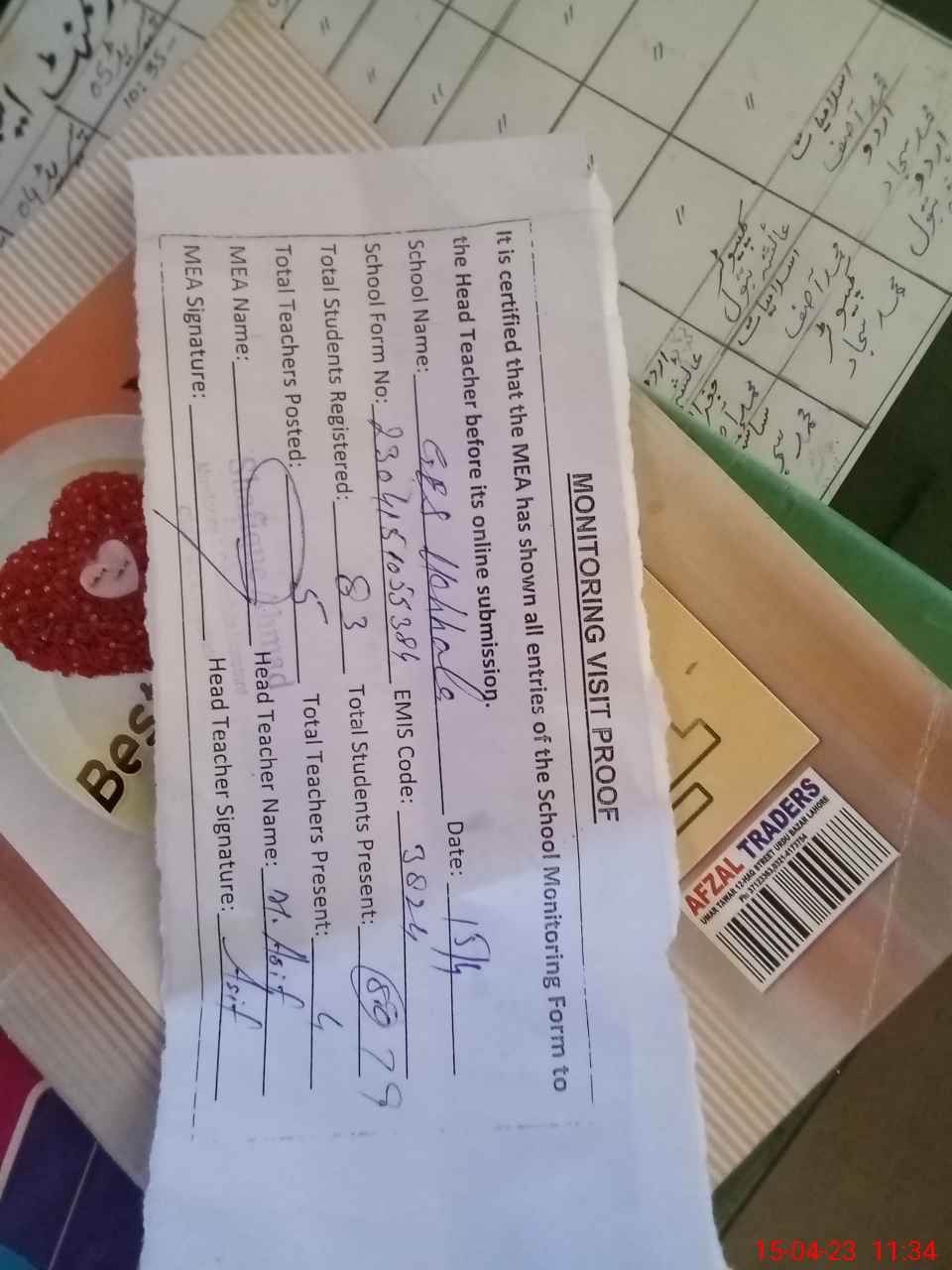 | Attendance Register | Head Teacher | MEA with School | Visit Proof |