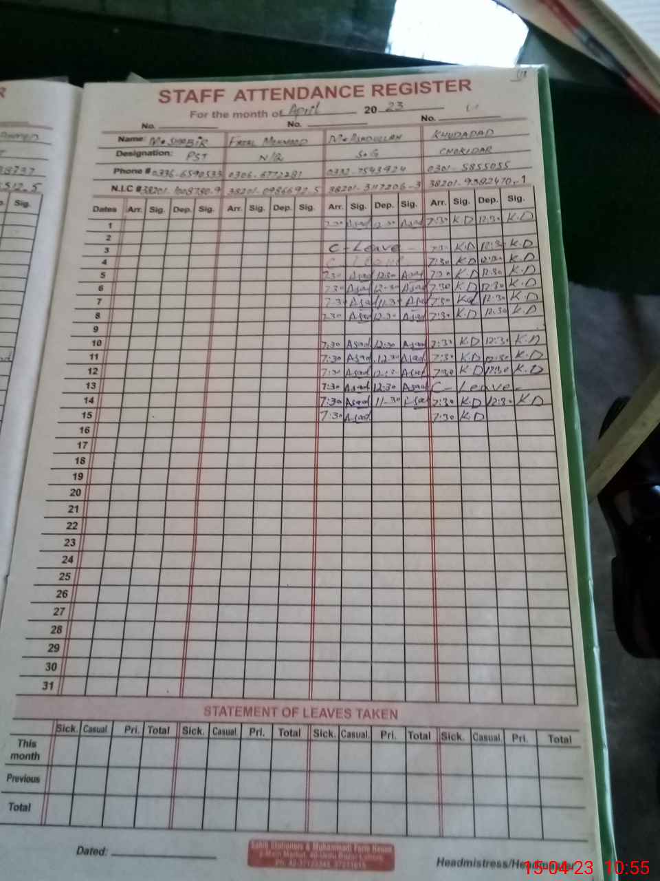 | CNIC | Full Name | Designation | R/C | Absence During Last Calender Month |