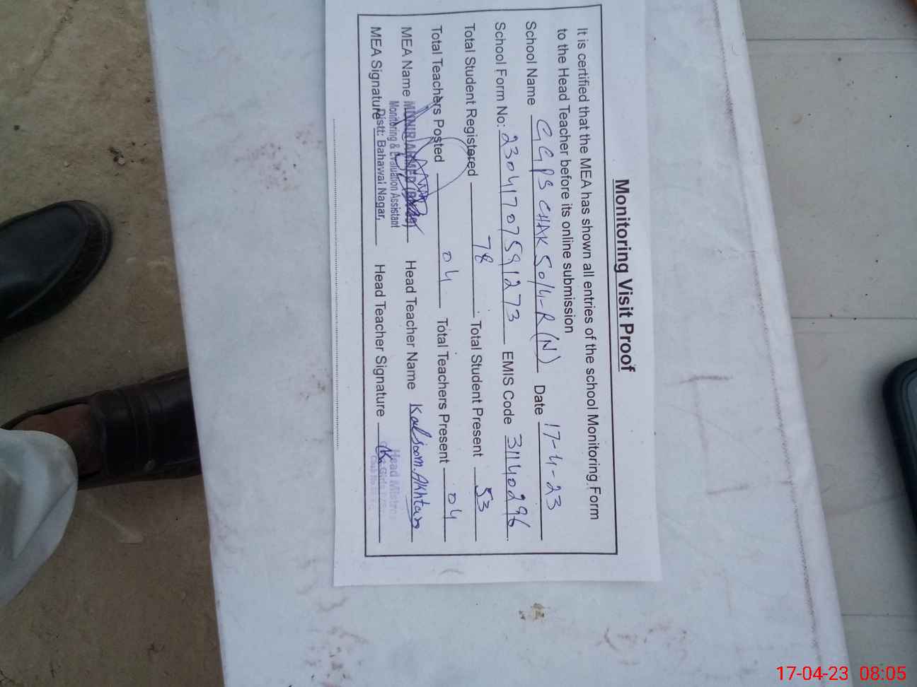 | Attendance Register | Head Teacher | MEA with School | Visit Proof |