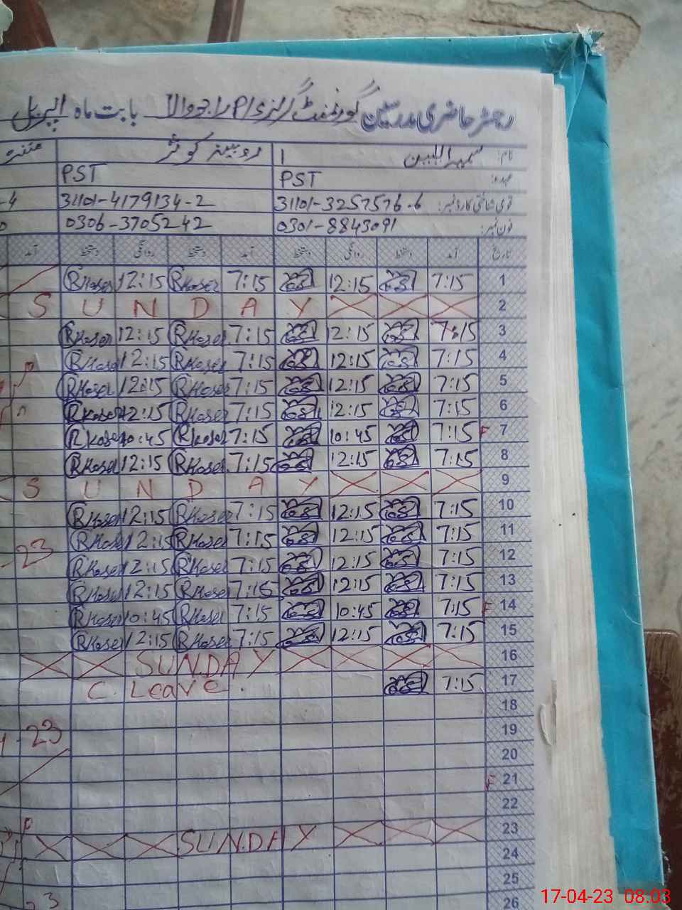 | CNIC | Full Name | Designation | R/C | Absence During Last Calender Month |