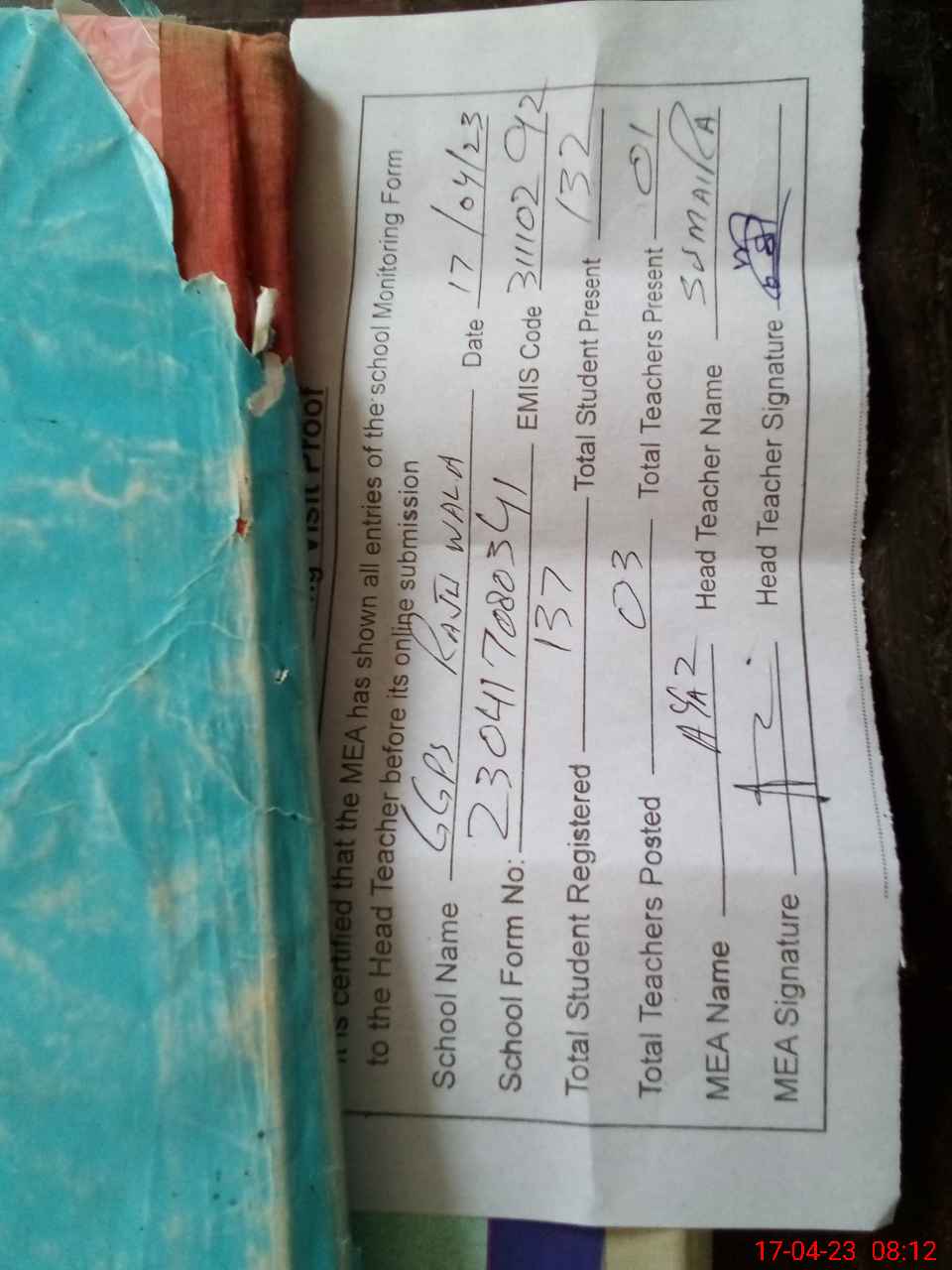 | Attendance Register | Head Teacher | MEA with School | Visit Proof |