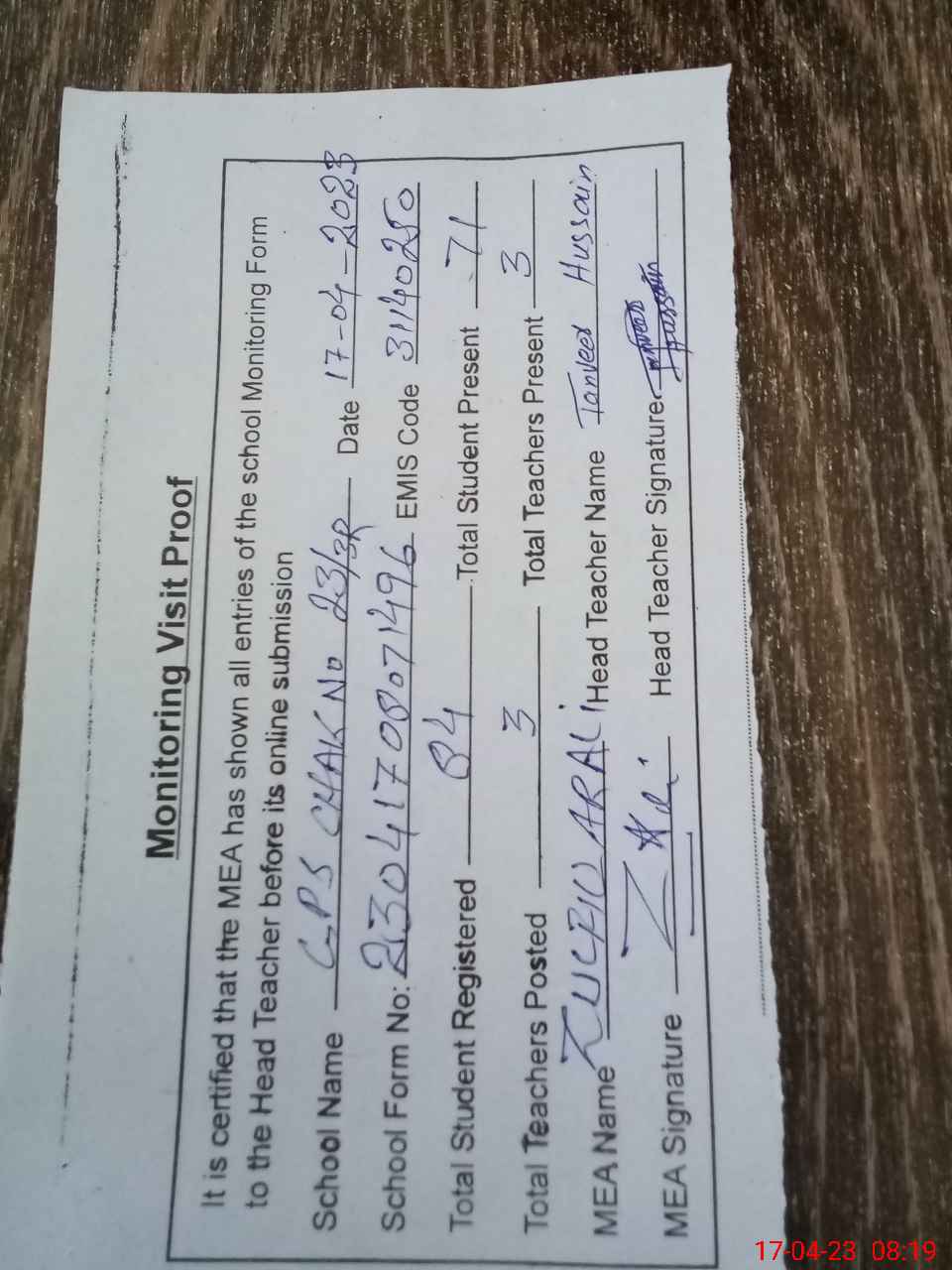 | Attendance Register | Head Teacher | MEA with School | Visit Proof |