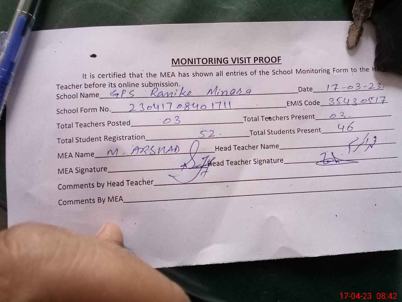 | Attendance Register | Head Teacher | MEA with School | Visit Proof |
