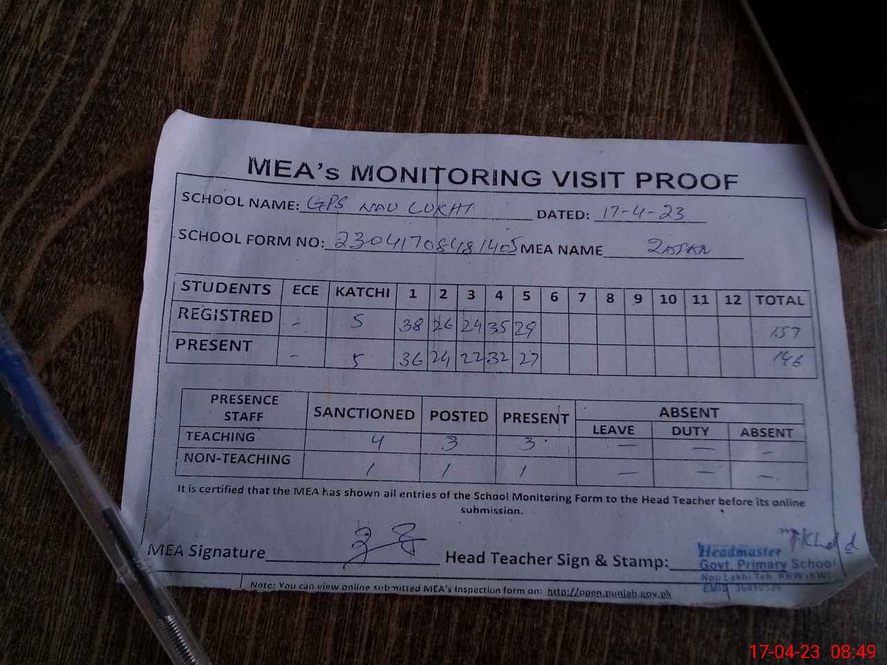 | Attendance Register | Head Teacher | MEA with School | Visit Proof |
