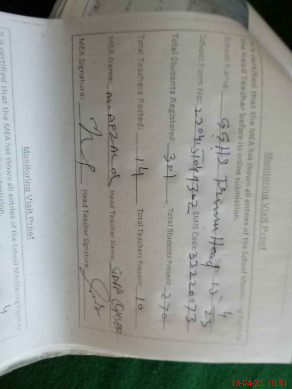 | Name: Qa**** UnNi**** Si**** Designation: (School Headmaster's/Headmistress's) In charge HEADMISTRESS Phone/Cell Number: 03**** |