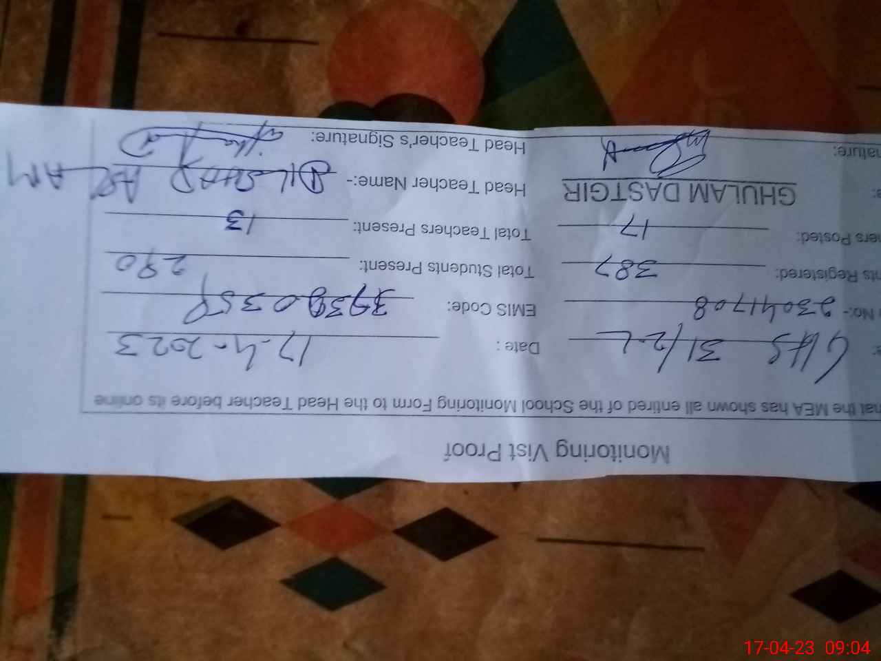 | Attendance Register | Head Teacher | MEA with School | Visit Proof |