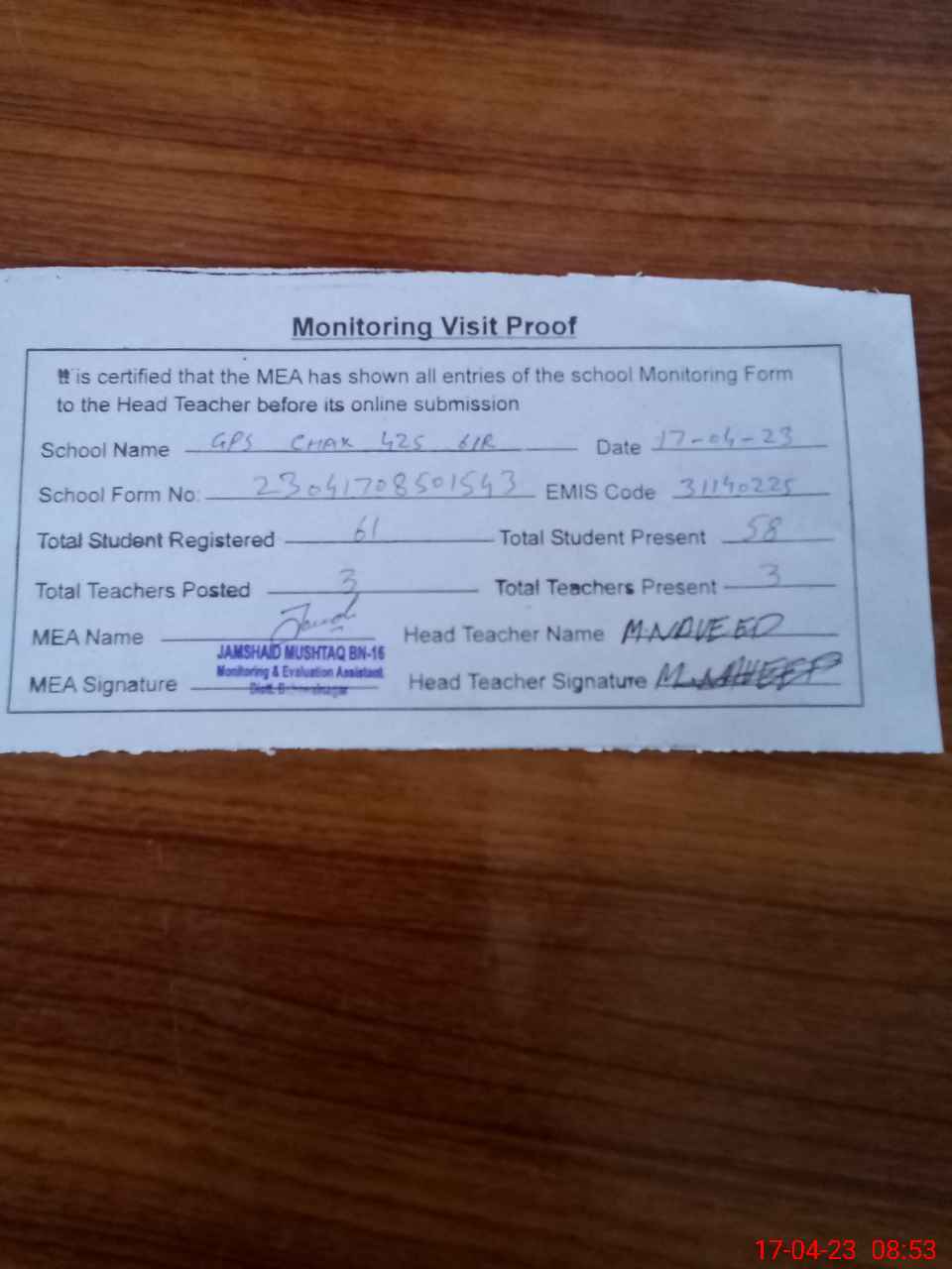 | Attendance Register | Head Teacher | MEA with School | Visit Proof |
