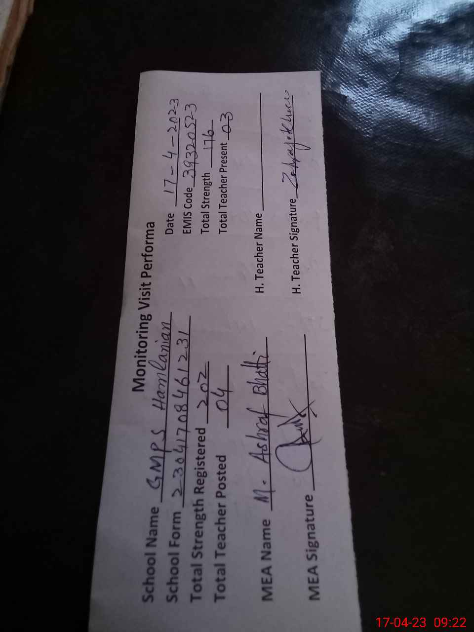 | Attendance Register | Head Teacher | MEA with School | Visit Proof |