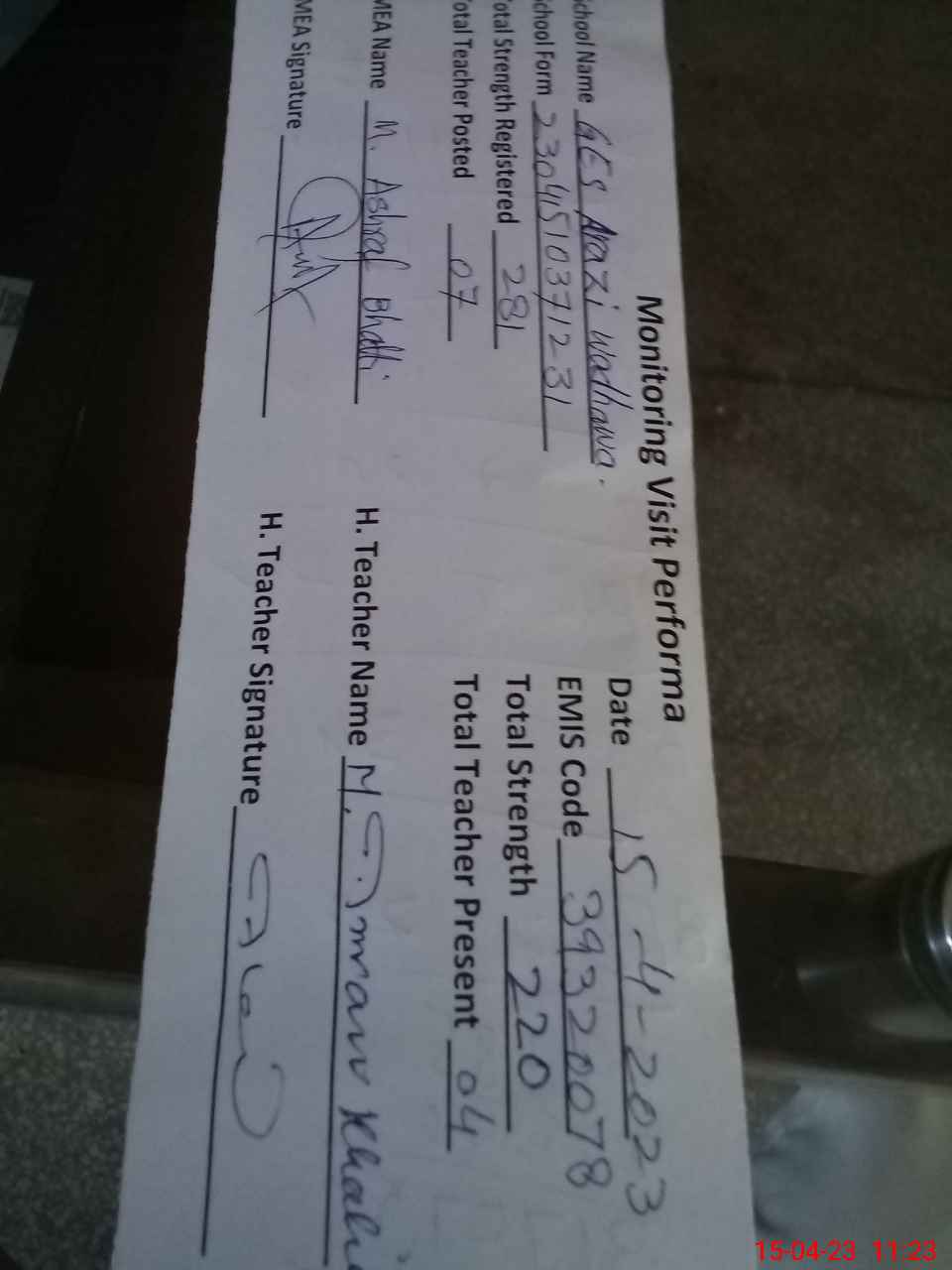 | Attendance Register | Head Teacher | MEA with School | Visit Proof |