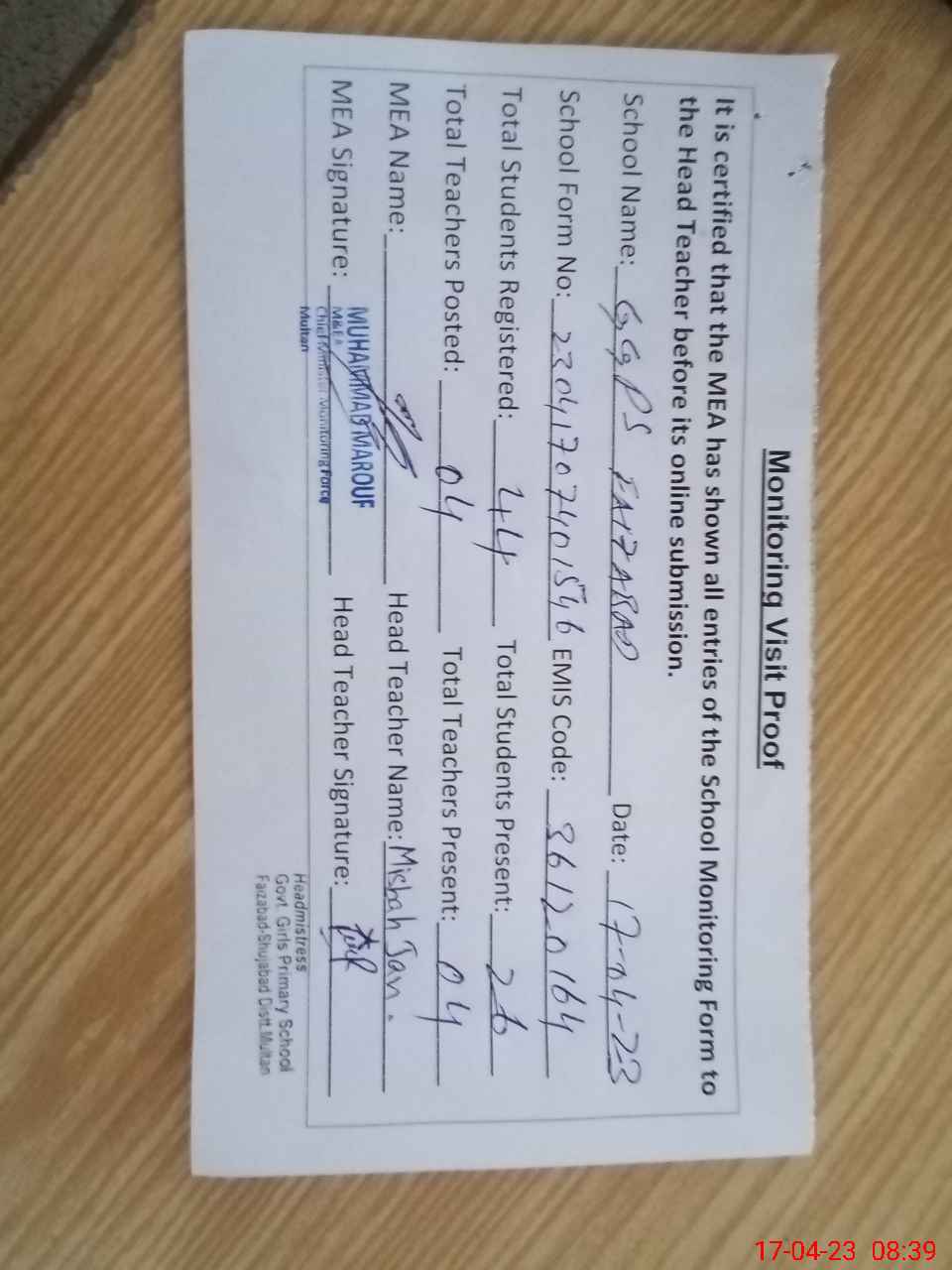 | EMIS Code: 36120164 | Name of School: GGPS FAIZ ABAD SHUJABAD | |||