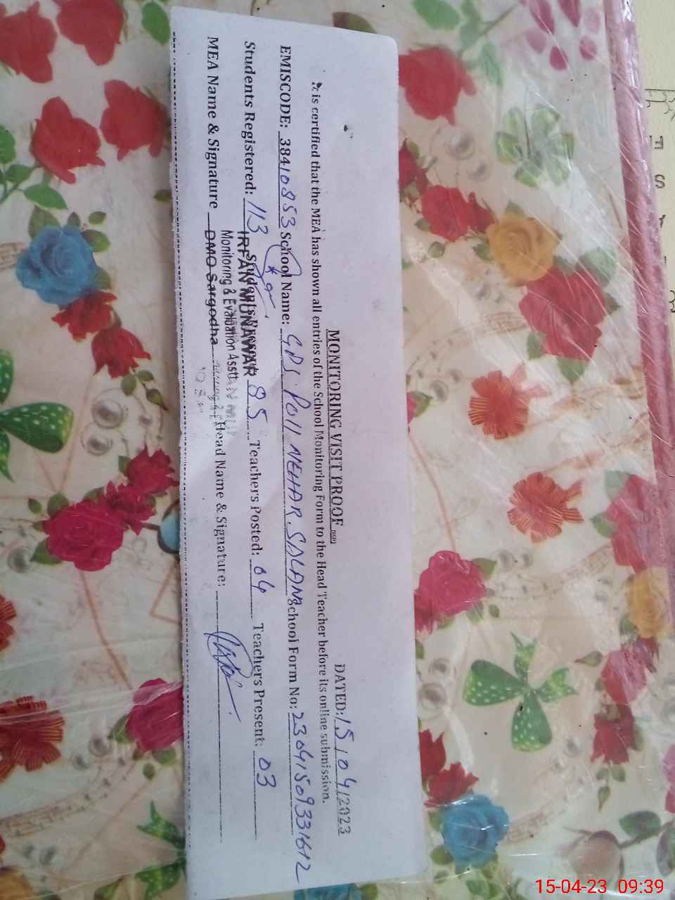 | Attendance Register | Head Teacher | MEA with School | Visit Proof |