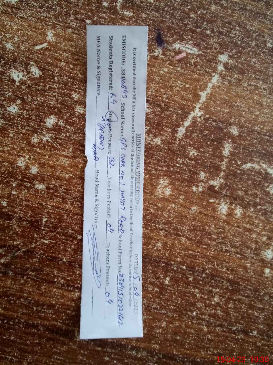 | Attendance Register | Head Teacher | MEA with School | Visit Proof |