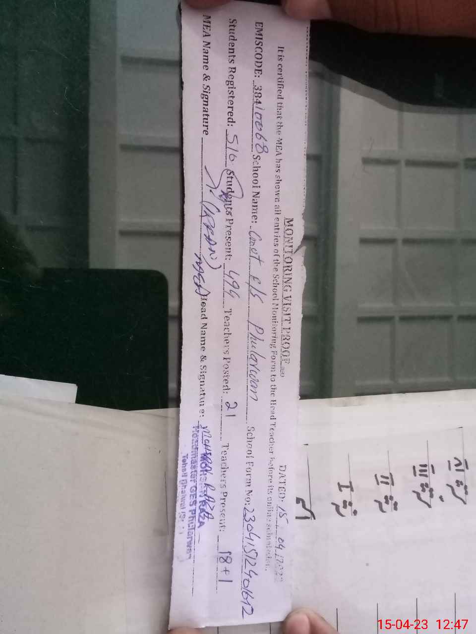 | Attendance Register | Head Teacher | MEA with School | Visit Proof |