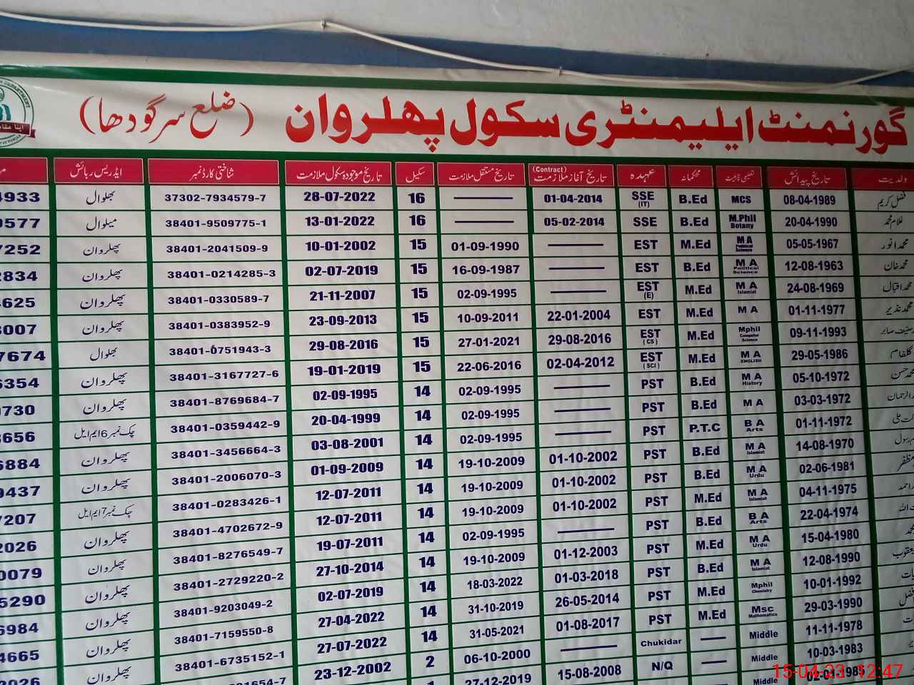 | District: SARGODHA | Tehsil: BHALWAL | Markaz: PHULARWAN - MALE | Level: Middle | |