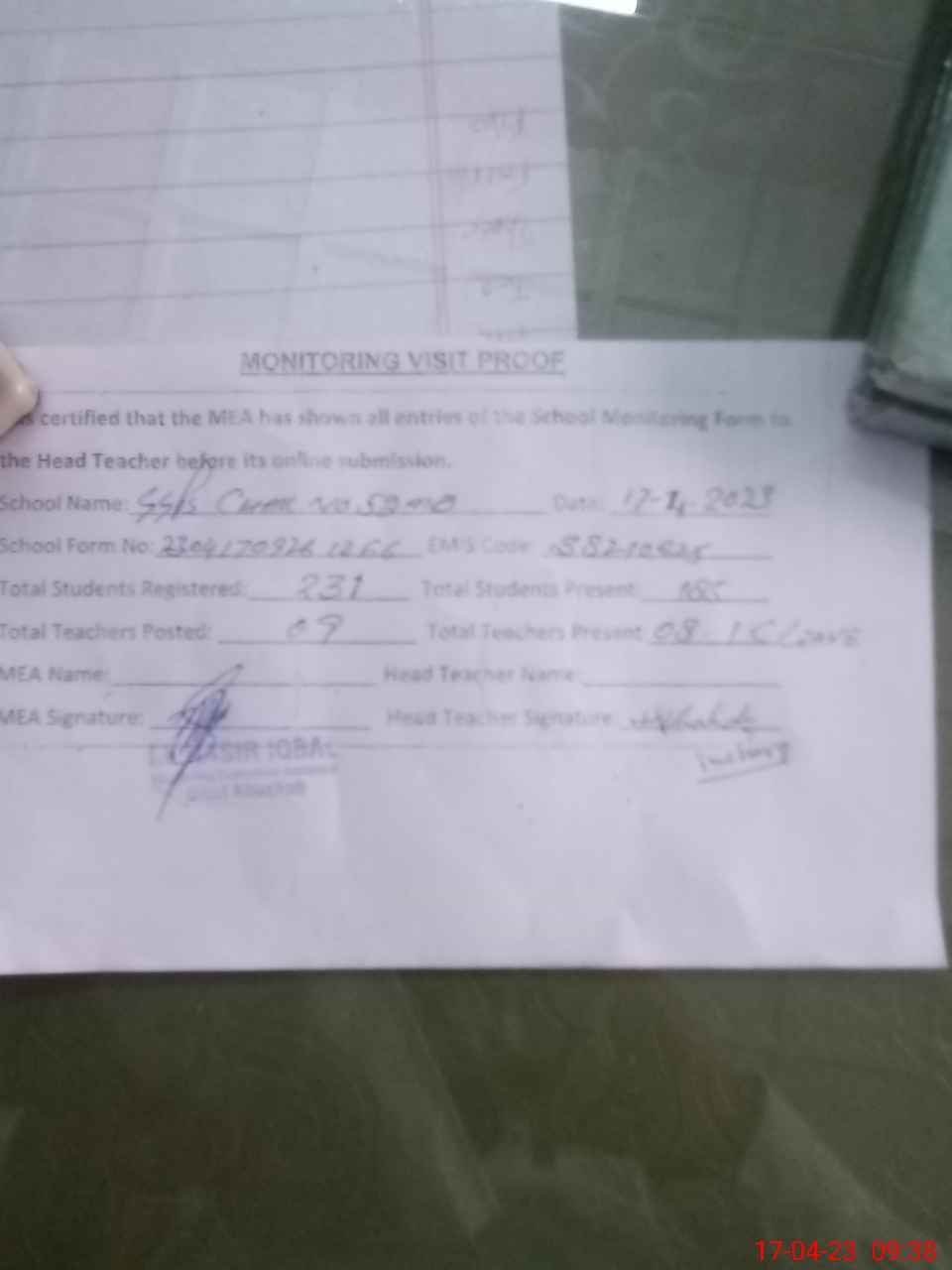 | Attendance Register | Head Teacher | MEA with School | Visit Proof |