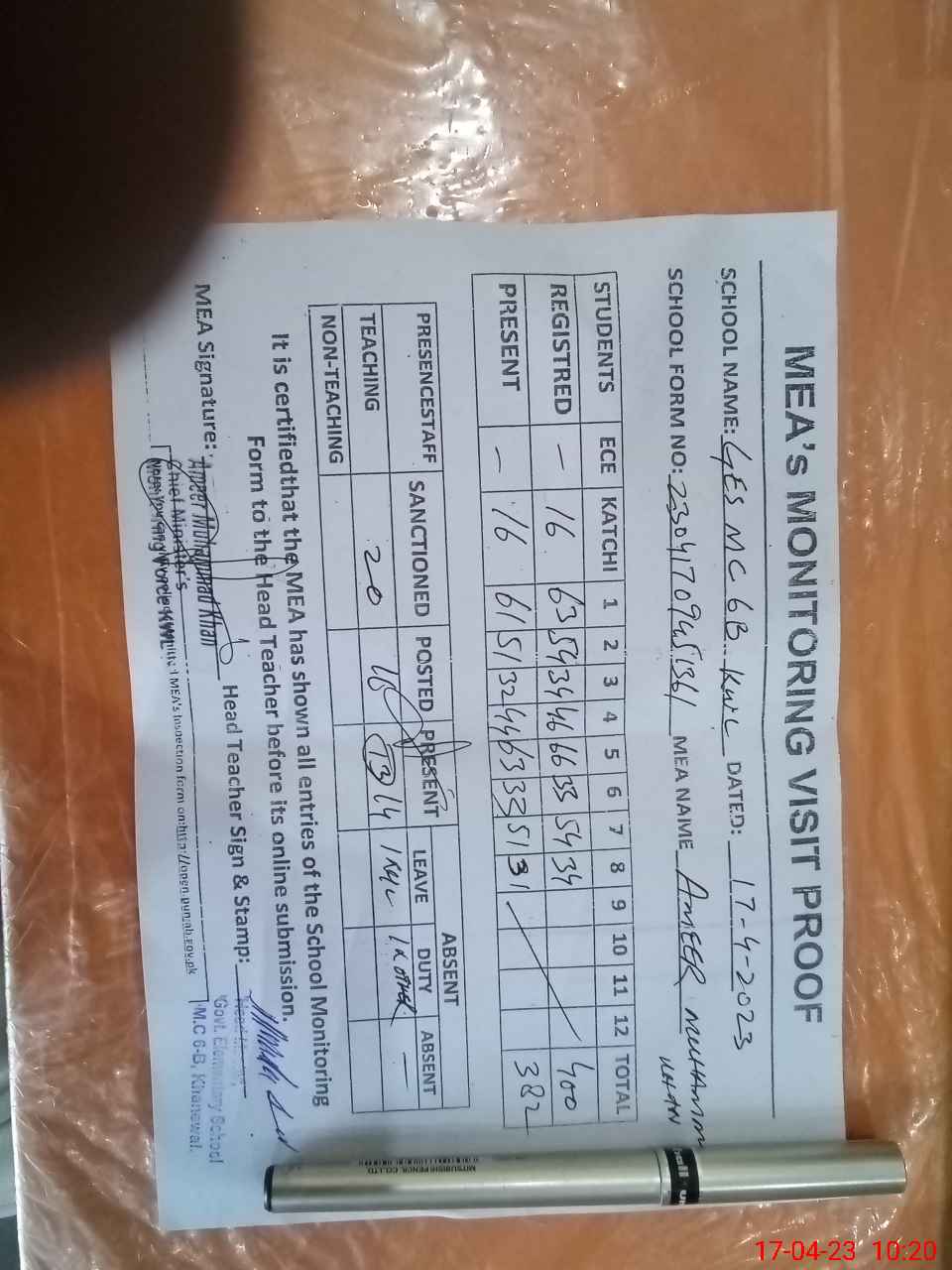 | Attendance Register | Head Teacher | MEA with School | Visit Proof |