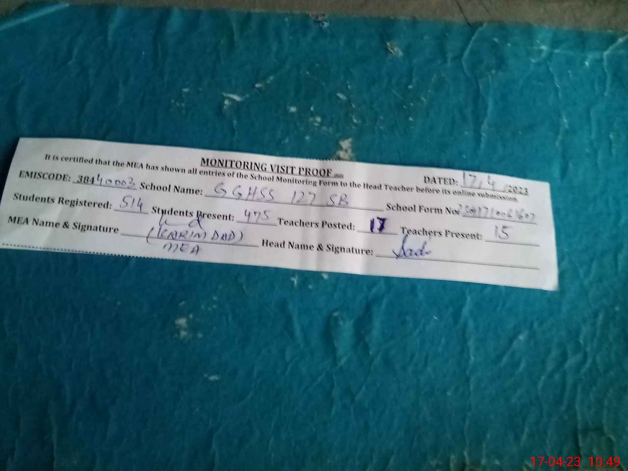 | EMIS Code: 38440003 | Name of School: GGHSS CHAK NO.127 SB | |||
