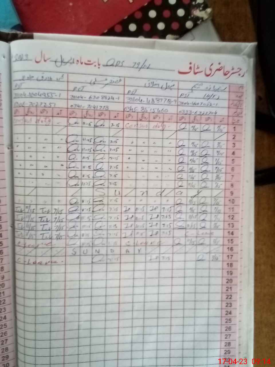 | CNIC | Full Name | Designation | R/C | Absence During Last Calender Month |