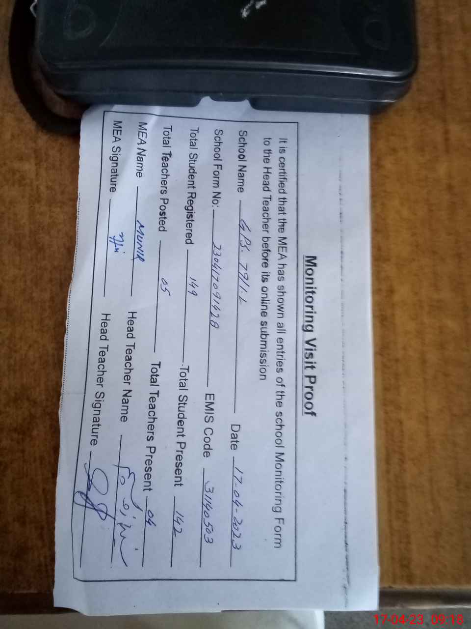 | Attendance Register | Head Teacher | MEA with School | Visit Proof |