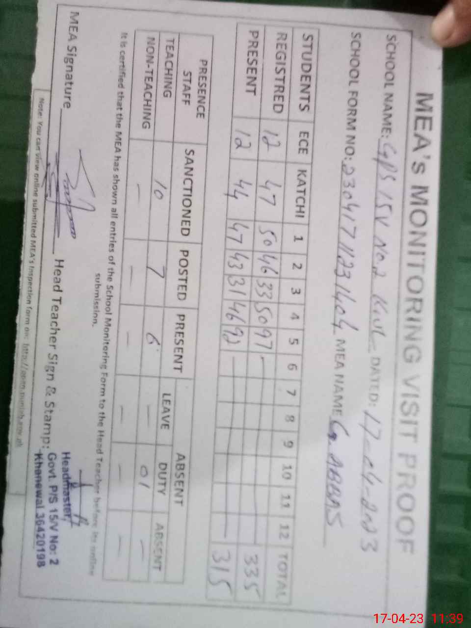 | Attendance Register | Head Teacher | MEA with School | Visit Proof |