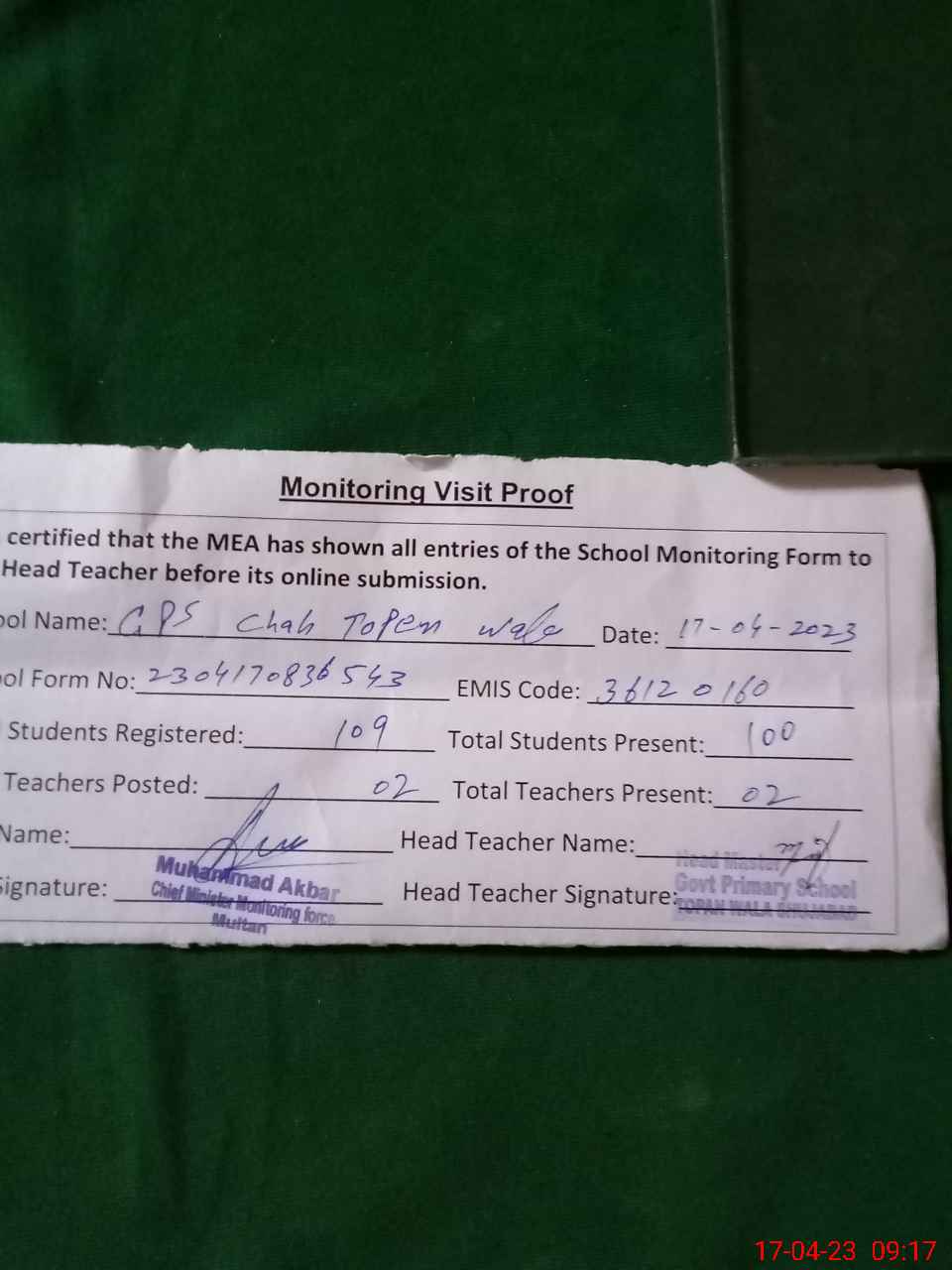 | EMIS Code: 36120160 | Name of School: GPS CHAH TOPAN WALA MUZA NASEER PUR | |||