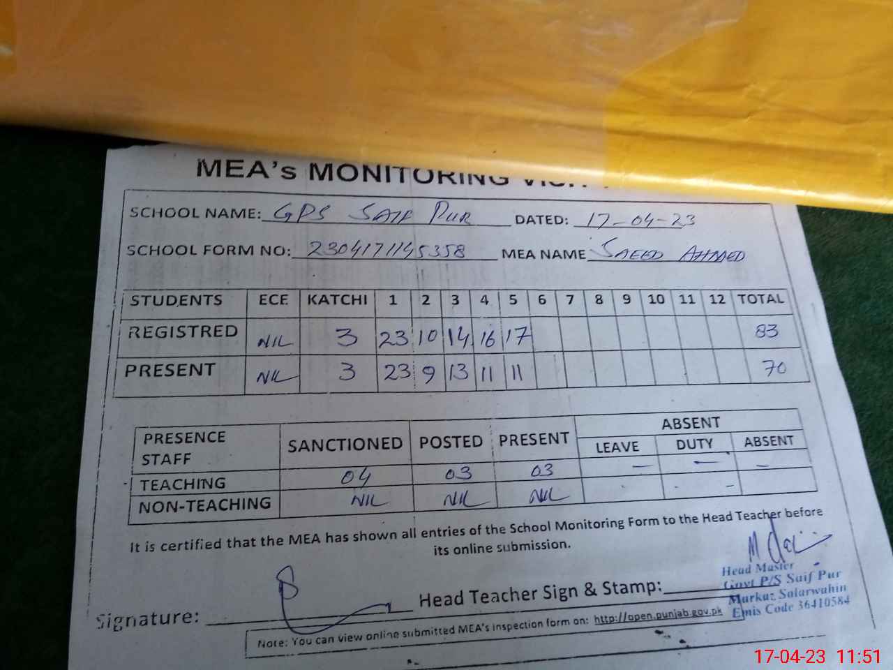 | EMIS Code: 36410584 | Name of School: GPS SAIF PUR, P/O MAAN KOT, NAWAN SHEHR | |||
