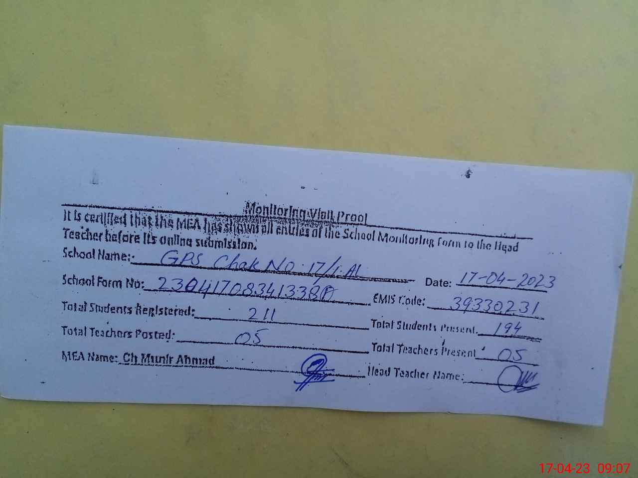 | EMIS Code: 39330231 | Name of School: GPS CHAK 17/1-AL | |||