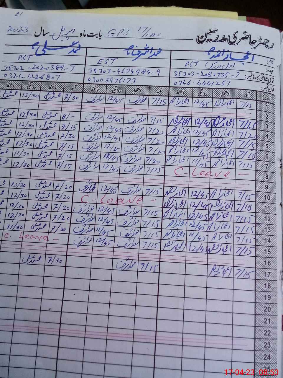 | CNIC | Full Name | Designation | R/C | Absence During Last Calender Month |
