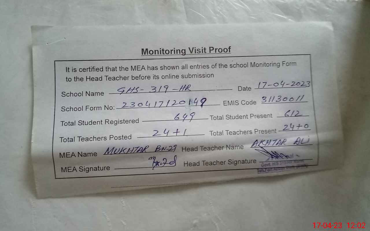 | Attendance Register | Head Teacher | MEA with School | Visit Proof |